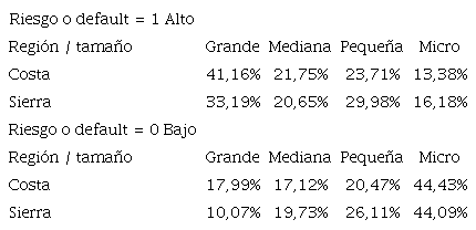 En la tabla 4, se evalúa el riesgo de clientes por región y tamaño de empresa; en esta se observa que un 33,19% y un 29,98% de las grandes y pequeñas empresas tienen un alto riesgo de crédito y están ubicadas en la Sierra. En contraste, un 44,43% y un 20,47% de las micro y pequeñas empresas, respectivamente, tienen un bajo riesgo y están ubicadas en la región Costa.