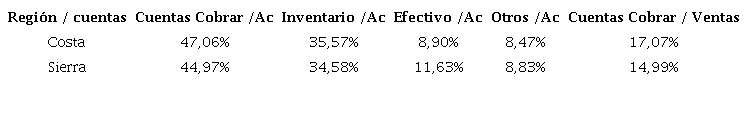 Además, en la tabla 5 se compara la inversión de las cuentas por cobrar de las empresas por regiones con respecto al activo circulante total y las ventas; se observa que la Sierra representa un 44,97% frente a un 47,06% en la Costa, lo que muestra una mayor inversión de las empresas de la región Costa.