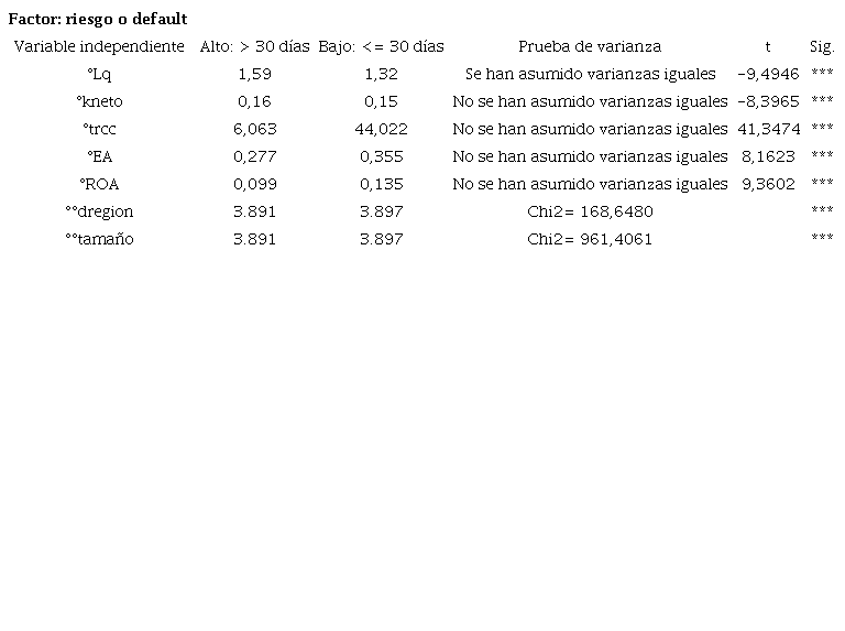Por otro lado, se realizó un análisis estadístico de tipo inferencial, cuyo fundamento es el conocimiento de poblaciones a partir del estudio de muestras de dichas poblaciones (Borrego del Pino, 2008), para lo cual se ha desarrollado un análisis de comparación de medias de las dos muestras de empresas con alto y bajo riesgo crediticio, a través de la prueba t de Student y el chi cuadrado de Pearson, en busca de diferencias estadísticamente significativas (Etxeberría y Tejedor, 2006; Rubio y Berlanga, 2012).