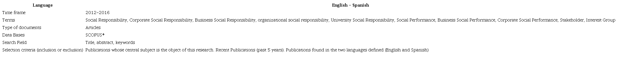 For the analysis of publications, the methodology proposed by Martínez, Bravo, and Becerra (2013) was followed. It comprises the collection, processing, and analysis of bibliometric information for the generation of results. The Scopus® database was selected as it is the largest base for abstracts and bibliographical references for scientific literature reviewed by academic peers, counting 18,000 titles and 5,000 international publishers; today, it is the best tool for bibliometric studies on scientific production, added to an increase in the number of publications on CSR between 2000 and 2018, as compared with other multidisciplinary databases (Smolarek & Sipa, 2020).