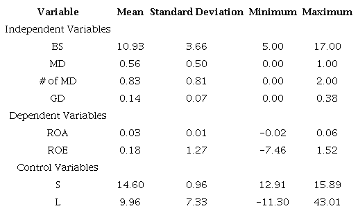 Regarding the dependent variables ROA and ROE, mean values are 3% and 18%, respectively. In two occasions there appears to be negative ROA values; in the case of ROE, this happens only once.