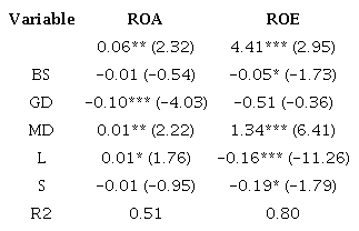To test for the normality of residuals, it is possible to use the Jarque-Bera test. The null hypothesis is that residuals are normally distributed. The p-value obtained for this test when ROA is the dependent variable is 0.32; therefore, residuals are normally distributed at a 10% significance level. On the other hand, when the dependent variable is ROE, the p-value for the Jarque-Bera test is 0.03 and normality of residuals is rejected. The major implication of this is that it is harder to make accurate forecasts with the model (which is not the intention of this study). Econometric results are shown in table 3.