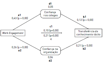 Como podemos verificar na figura 1, existem relações positivas e significativas do work engagement para com a confiança nos colegas (a1) e com a confiança na organização (a2), pressuposto inicial para a mediação, pelo que, quanto mais work engagement o trabalhador experienciar, mais confiança terá nos colegas e na organização. É também possível observar uma relação positiva e significativa entre as variáveis mediadoras e a transferência de conhecimento tácito (b1, b2), ou seja, quanto maior a confiança nos colegas e na organização, maior é a transferência de conhecimento tácito.