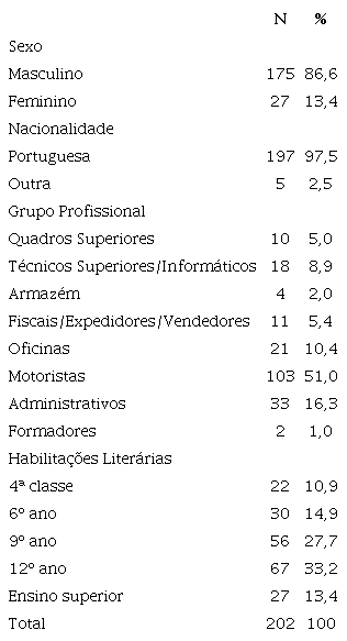 A amostra deste estudo é constituída por 202 trabalhadores de uma empresa de transportes públicos de passageiros na Ilha da Madeira, Portugal, como podemos verificar na tabela 1. Esta organização foi selecionada tendo como critério a facilidade de acesso aos seus trabalhadores. Obteve-se uma taxa de resposta de 42,26%.