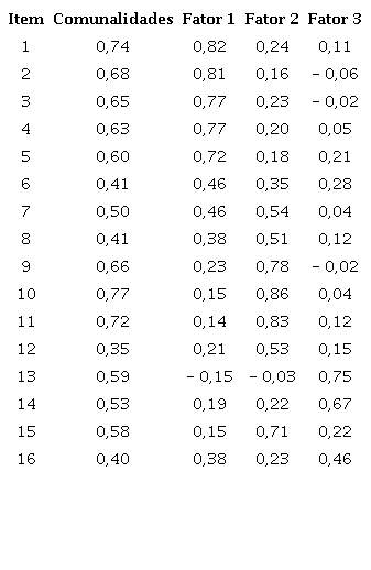 Já relativamente ao questionário de conhecimento tácito, quando realizada esta análise, presente na tabela 4, apresentou três fatores (Fator 1: Causas Idiossincráticas; Fator 2: Estratégia Organizacional de Gestão de Conhecimento; Fator 3: Contexto Organizacional), como no estudo original, mas com saturações em itens diferentes.