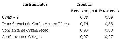 Foi aplicado um questionário sociodemográfico para caraterizar a amostra. Com o objetivo de avaliar o work engagement, foi utilizado o questionário Utrecht Work Engagement Scale, versão reduzida (UWES - 9), de Schaufeli, Salanova, González-Romá e Bakker (2002) , adaptado para Portugal por Martins (2013) . A transferência de conhecimento tácito foi avaliada com o questionário de Lemos e Joia (2012) . A confiança na organização foi medida com o instrumento desenvolvido por Gabarro e Athos (1976) e adaptado por Robinson e Roseau (1994) . E, para avaliar a confiança nos colegas, foi utilizado o instrumento Trust in Teams Scale, desenvolvido por Adams, Bruyn e Chung-Yan (2004) , e adaptado por Adams, Waldherr e Sartori (2008).