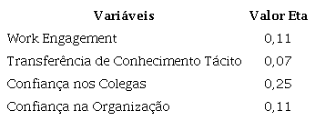 Verificou-se o coeficiente de correlação Eta, entre a variável nominal “fazer parte de uma equipe” e as restantes variáveis para verificar a relação entre elas. É possível verificar na tabela 6 que existe alguma relação entre as variáveis, apesar de um pouco baixas, sendo, a mais baixa, a relação com a transferência de conhecimento tácito (0,07) e, a mais alta, a relação com a confiança nos colegas (0,25). No entanto, fazer parte de uma equipe influencia as restantes variáveis.