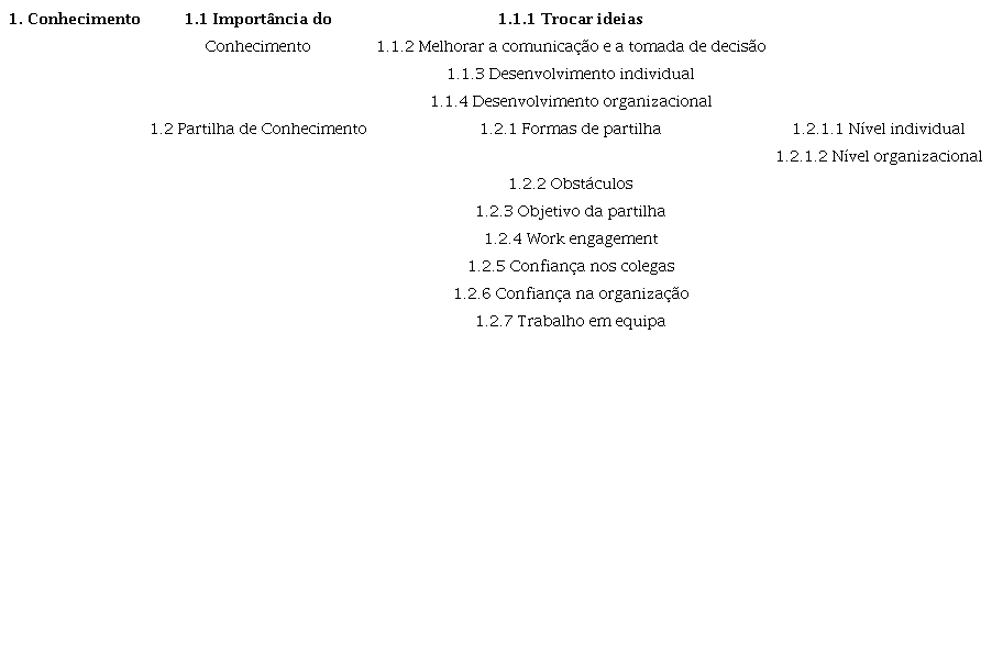 Ao nível da Partilha de Conhecimento (1.2) foram encontrados 2 níveis: 1.2.1.1 Nível individual (“(…) normalmente faço por e-mail ou envio algumas informações extra ou documentos (…)” E4) e 1.2.1.2 Nível organizacional (“(…) nós temos várias reuniões e partilhamos sempre várias ideias antes de concluir qualquer tarefa.” E1). Estes níveis demonstram o papel importante que, tanto os indivíduos como a própria organização, têm, em fomentar a partilha de conhecimento.