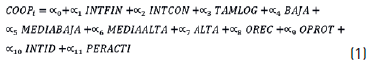 En el modelo 1 se analiza el efecto que ejercen los intermediarios y el tamaño de la empresa sobre la cooperación con actores externos. Asimismo, en este modelo se incluyen las variables de control explicadas en el apartado anterior. En el segundo modelo se incluyen, además, dos términos interactivos derivados de multiplicar las variables referidas al relacionamiento con intermediarios (INTFIN e INTCON) por la variable TAMLOG. Estos últimos términos se incluyen con el objetivo de contrastar las hipótesis 3 y 4 planteadas en el presente trabajo, asociadas con el efecto moderador del tamaño de la empresa. En ambos modelos, la variable dependiente COOPi hace referencia de forma general a los diferentes tipos de cooperación considerados en el estudio (COOPID, COOPMAQ, COOPTTEC, COOPCON). Lo anterior implica que el modelo se estima cuatro veces, una por cada tipo de cooperación. Teniendo en cuenta la naturaleza dicotómica de las variables dependientes, se emplea como técnica de estimación la regresión logística binaria.