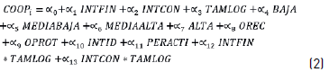Tal como se ha señalado, el objetivo de este artículo fue analizar el efecto de los intermediarios sobre la cooperación en actividades de innovación; se distingue entre cuatro tipos de cooperación en función del objetivo específico perseguido: COOPID, COOPMAQ, COOPTTEC y COOPCON. Adicionalmente, en el análisis se tiene en cuenta tanto el efecto directo de los intermediarios como también el efecto mediador del tamaño de la empresa. Atendiendo a lo anterior, se han definido dos especificaciones econométricas generales que se estiman para cada una de las variables dependientes consideradas.