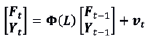 (1)En donde Yt muestra el vector de variables visibles, que en este caso debe ser una variable que mida la actividad empresarial. El vector se puede representar como una matriz de M×1, donde las variables que lo componen tienen una frecuencia temporal t=1,2,…T . Igualmente, se estructura un factor de información Ft , cuyas dimensiones son K×1, y acumula factores compuestos por información no observable que, en este caso, es el nivel de incertidumbre. En esa línea, (L ) es la matriz de estimadores de orden d, vi y t simboliza el término de error, con media cero y varianza constante.