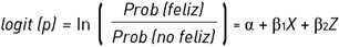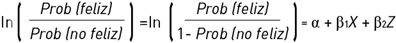 donde X es un vector de las variables de bienestar económico objetivo, Z es un vector de las variables de control y p es la probabilidad de estar satisfecho con la vida, o de que la variable tome el valor 1. Dado que la variable “feliz”, por dicotómica, toma dos valores (0,1), el modelo puede reformularse:
