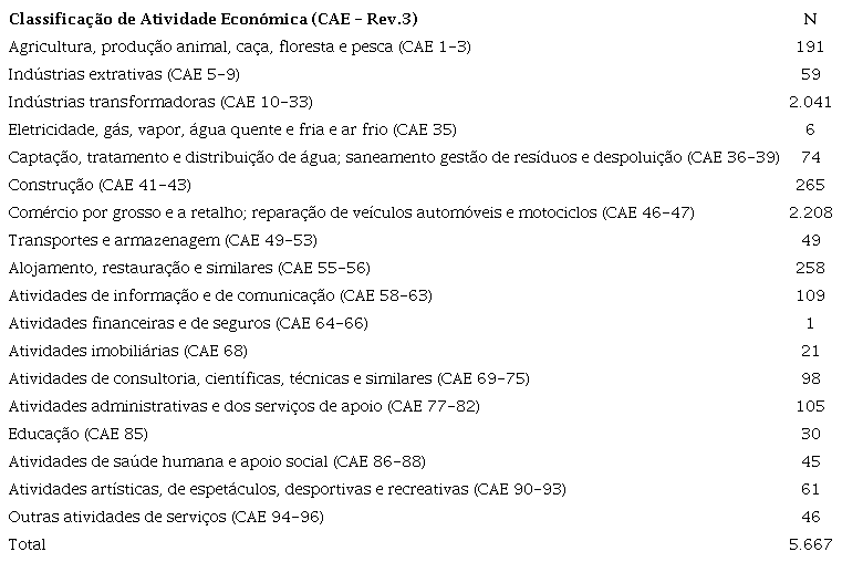 É de se notar a predominância na amostra de determinados setores de atividade, como as indústrias transformadoras e o comércio por grosso e a retalho e reparação de veículos automóveis e motociclos, com 2.041 e 2.208 empresas respetivamente. É também de realce a fraca presença de empresas das CAE 35 e 64-66, respetivamente com seis e uma empresas, e a ausên-cia de empresas de áreas como a administração pública e defesa - segurança social obrigatória, atividades das famílias empregadoras de pessoal doméstico e atividades de produção e atividades dos organismos internacionais e outras instituições extraterritoriais.