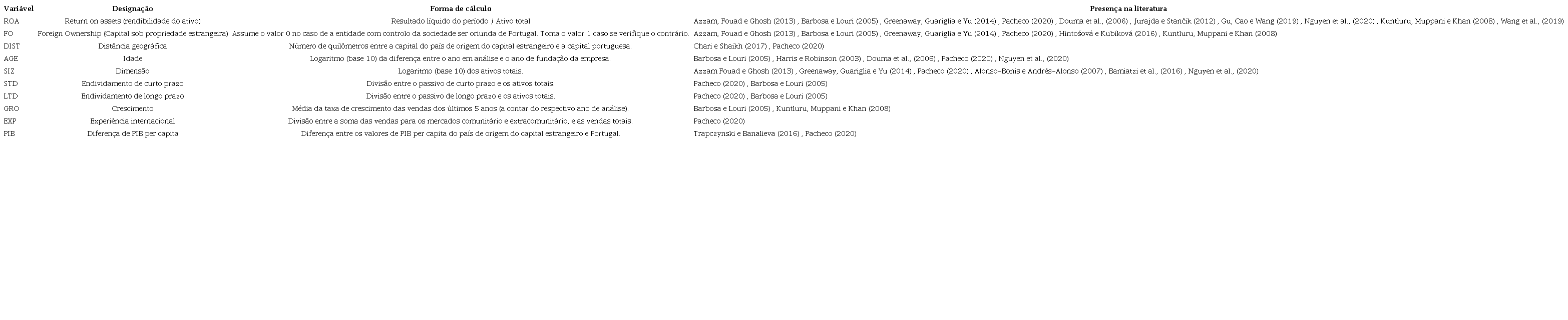 Foram utilizadas várias variáveis na construção do modelo que será trabalhado e analisado em prol da resposta às hipóteses anteriormente colocadas. Para facilitar a consulta e explicação das variáveis indicadas a seguir, as mesmas são apresentadas e caraterizadas na Tabela 2. Como variável dependente, foi utilizado o Return on Assets (ROA), ou seja, a rendibilidade do ativo. Como variável independente, foi utilizado o Foreign Ownership (FO), ou seja, a percentagem do capital da empresa detida por estrangeiros. Como variáveis de controlo, utilizaram-se as variáveis DIST, AGE, SIZ, STD, LTD, GRO, EXP e PIB, descritas na tabela. A variável PIB foi incluída no modelo como proxy da diferença entre Por-tugal e os países de origem dos capitais estrangeiros, no que toca à qualidade das suas instituições, tendo igualmente sido testadas as diferenças em termos de desenvolvimento humano, medidas pelo IDH (Índice de Desenvolvimento Humano), embora essa variável não se tenha revelado significativa. Segundo Trapczynski e Banalieva (2016) , Chari e Shaikh (2017) e Pacheco (2020) , para além da distância física, as variáveis refe-ridas são tradicionalmente representativas deste con-ceito de distância institucional, fazendo referência a componentes que estão diretamente relacionadas com o desenvolvimento institucional, como o desenvolvimento económico e social.