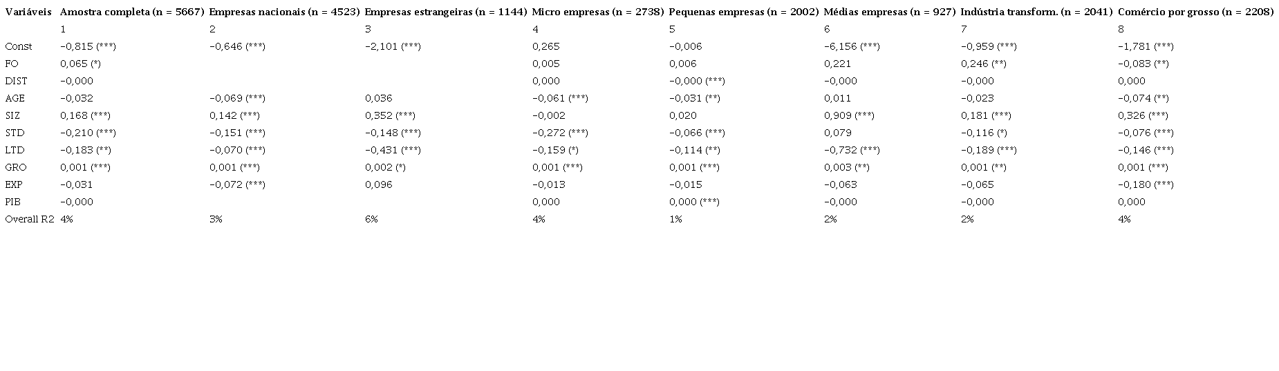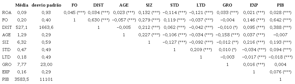 Na Tabela 3, destacam-se os seguintes aspetos. Na variável FO, notamos a grande preponderância na amostra de empresas com capital português, dado o valor da média de apenas 0,20. Verifica-se uma elevada dispersão na distância de origem dos capitais. No que toca à variável AGE, observamos que as empresas têm em média um valor de 1,29, ou seja, aproximadamente 19 anos de existência. A variável SIZ apresenta valores médios de 6,32, o que corresponde aproximadamente a 2 milhões de euros, refletindo a grande presença de micro e pequenas empresas na amostra. As variáveis STD e LTD apresentam médias de 0,47 e 0,18, o que significa que grande parte das empresas da amostra tem uma percentagem reduzida de dívida de longo prazo, em comparação com a dívida de curto prazo. A variável EXP apresenta uma média de 0,16, o que demonstra uma presença reduzida da generalidade das empresas portuguesas no exterior e, finalmente, a variável PIB diz-nos que, em média, os países de origem do capital estrangeiro possuem níveis de PIB per capita superior ao português. No entanto, convém notar a existência de uma elevada dispersão nos valores desta variável. Relativamente às correlações, destaca-se a correlação superior a 0,6 entre as variáveis FO e DIST e FO e PIB, a qual se deve ao facto de o capital estrangeiro ser maioritariamente oriundo de países relativamente distantes e com níveis de PIB per capita mais elevados.