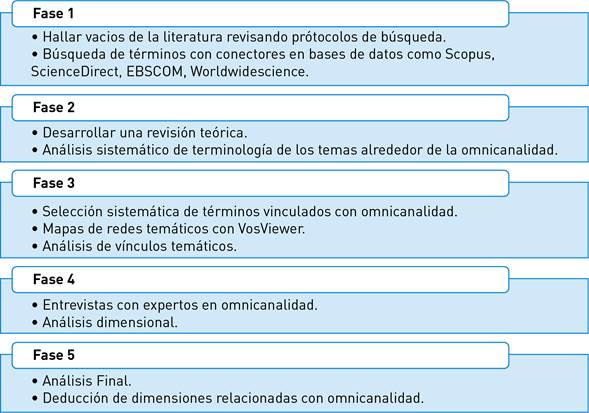 Se empleó una metodología de investigación cualitativa, con un alcance descriptivo, en la que se aplicaron tres métodos: el primero fue una revisión teórica que establece dimensiones de línea de base vinculadas con la mencionada estrategia omnicanal en las empresas; el segundo, una revisión de mapa de redes temáticas, y el tercer método se basa en entrevistas con expertos que trabajan en las empresas Webcentrix y Ecomsur, desarrolladoras de estrategias omnicanal, elegidas como tal por su conocimiento en la estrategia omnicanal y años de experiencia. En la figura 1 se aprecia el proceso seguido en la metodología para realizar el estudio cualitativo en este documento.