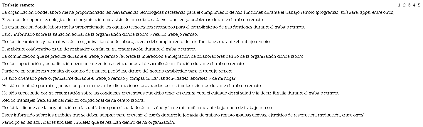 Palabras clave: Análisis factorial exploratorio, propiedades psicométricas, trabajo remoto, COVID-19.