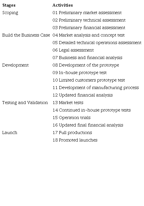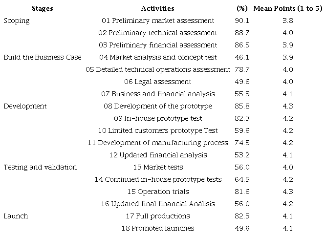 Since the beginning of the NPDP approach, Cooper & Kleinschmidt (1986) suggested that companies should execute 13 main activities. As time has gone by, however, they have been changing and increasing their degree of complexity. Recently, Cooper (2017) included more activities in the NPDP that are grouped in five stages (Table 1).