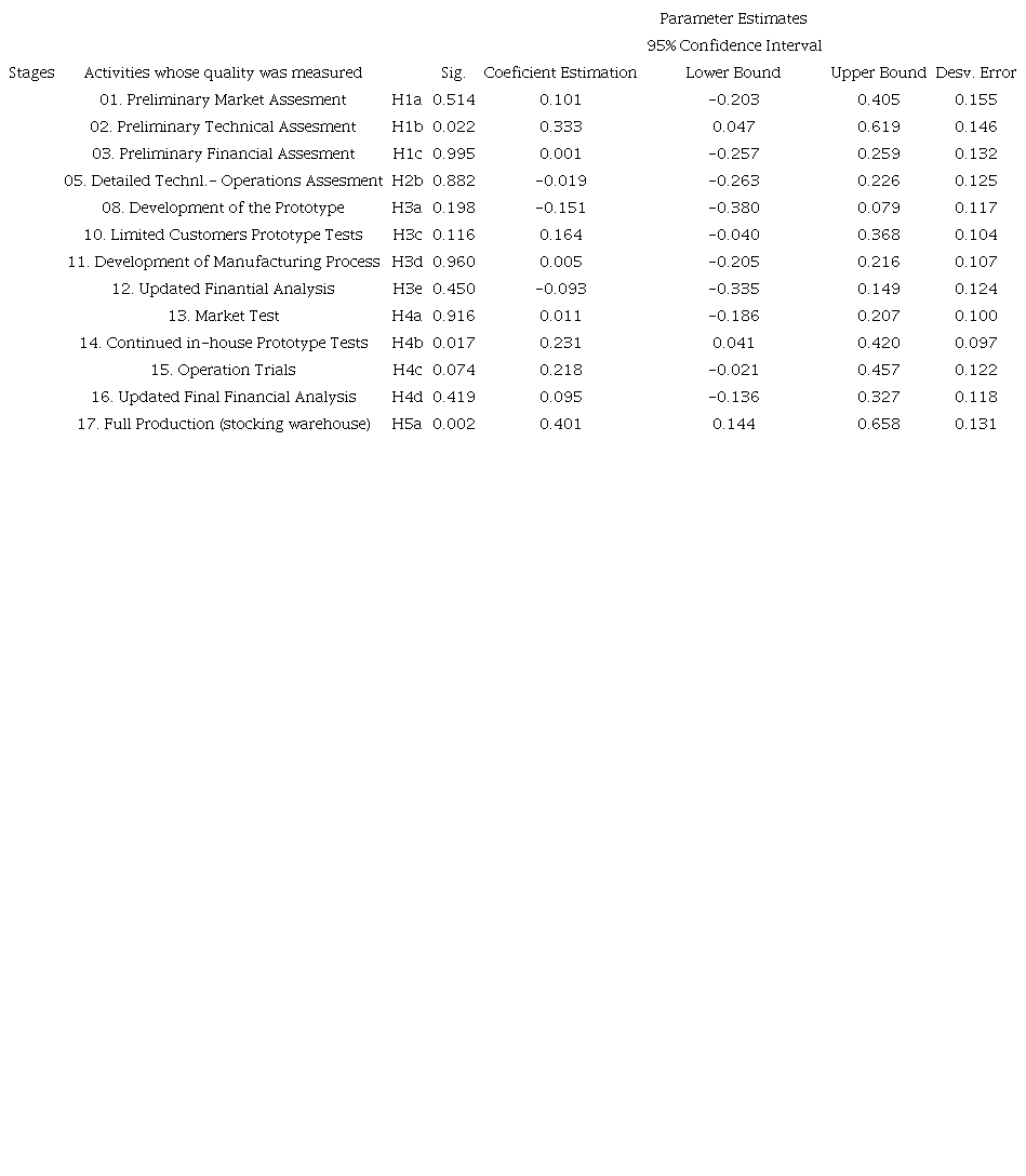 All this evidence does not support the conclusión that would establish the dependence of the new product success on the NPDP activities. Although the correlation analysis is instructive, the hypotheses must be tested through OLogit regressions as another alternative. Ordinal or logistic regression has been used previously in products or services research and in new products research, e.g., Youn and Gu (2010), Jespersen (2012), and De Sousa & Devos (2013). Thus, this research uses Ordinal Regression instead of a Linear Regression such as OLS because it does not fit well with ordinal variables. Also, using a Multinomial logistic regression was discarded because it assumes that categories are nominal, not ordinal. An Ordered Probit regression, similar to Ordinal Regression, could have been used, but the interpretation of the coefficients would have been different (UCLA, 2021). Table 6 shows that there are statistically significant results only for three variables: Quality in Preliminary technical assessment, Quality in Continued in-house prototype tests, and Quality in Full production. These three variables have positive values, which means that a greater probability of success in the new product should be expected if they are performed properly. Thus, the results support hypotheses 1b, 4b, and 5a.