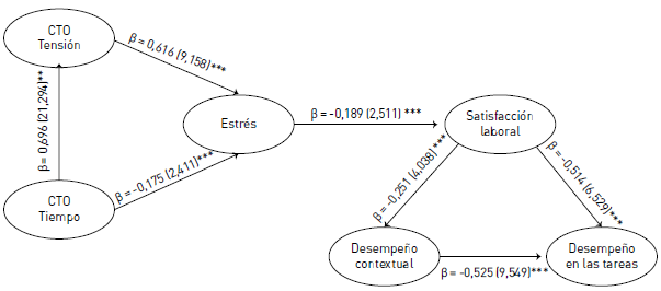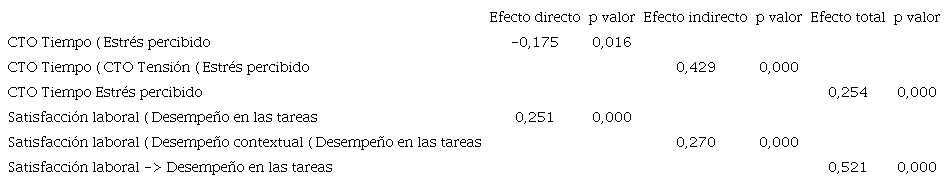 En este modelo se evaluaron dos mediaciones (tabla 5). Se identificó que existe mediación parcial competitiva entre CTO tiempo y estrés percibido, a través de CTO tensión (β directa -0,175, p = 0,016; β indirecta = 0,429, p = 0,000, β total = 0,254, p = 0,000). Ello implica que el conflicto trabajo-ocio basado en el tiempo disminuye de forma directa el estrés percibido, pero indirectamente lo incrementa, porque aumenta el conflicto trabajo- ocio basado en la tensión y este incrementa el estrés percibido. Asimismo, se estableció que existe mediación parcial complementaria entre la satisfacción laboral y el desempeño en las tareas, a través de desempeño contextual (β directa 0,251, p = 0,000; β indirecta = 0,270, p = 0,000, β total = 0,521, p = 0,000). En este caso, la satisfacción laboral tiene un doble efecto positivo en el desempeño en las tareas, pues lo incrementa de forma directa y también lo hace de forma indirecta, a través de su efecto en el desempeño contextual.