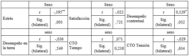 Además, se determinó la validez nomológica. Para ello, se correlacionaron los puntajes de los constructos del modelo con la variable sexo, pues se ha recomendado no ignorar la posible influencia que el sexo podría tener en la investigación sobre los conflictos vida-trabajo (Simmons et al., 2016). De acuerdo con los resultados, la correlación estrés-sexo evidencia una correlación significativa (p = 0,001), lo que coincide con investigaciones previas (Miller et al., 2000). Respecto a la satisfacción laboral, no se identificó correlación significativa en este trabajo (p = 0,721), lo que confirma lo señalado en estudios previos (Mottazl, 1986), tampoco se encontró correlación entre desempeño en la tarea y sexo (p = 0,549), lo que coincide con trabajos previos (Liberatore y Wagner, 2022). Por el contrario, se identificó una asociación significativa (p = 0,032) entre desempeño contextual y sexo, lo que coincide con el trabajo de Eagly y Carli (2007). Finalmente, en esta investigación no se encontró asociación entre sexo y conflicto trabajo-ocio de tiempo (p = 0,238) y tensión (p = 0,634), lo que coincide con los resultados del estudio de Karkoulian et al. (2016) sobre locus de control interno y conflicto vida-trabajo. Los resultados del análisis de correlación demuestran que existe validez nomológica en el modelo de medición (tabla 3). Por último, se revisó la validez predictiva, para asegurarse de que existe invarianza de medida de los modelos compuestos (Hair et al., 2020). Los resultados de la invarianza de composición y la igualdad de medias y varianzas en las puntuaciones de los constructos mostraron que las diferentes estimaciones entre grupos específicos no derivan de contenido o significado distinto (Henseler et al., 2016), como se muestra en la sección del análisis multigrupo.