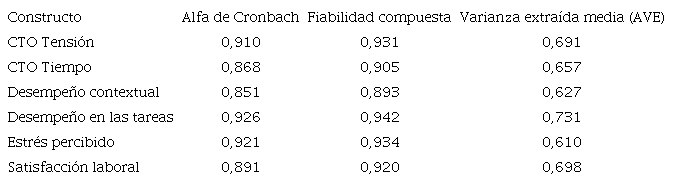 En el contexto PLS-SEM, el análisis apropiado para confirmar la calidad del modelo es el CCA (Hair et al., 2020). El primer paso es asegurarse de que las cargas factoriales estandarizadas son mayores de 0,70. Una vez eliminados los ítems ya señalados, los demás indicadores mostraron cargas factoriales que cumplen con el parámetro recomendado. El segundo paso consiste en elevar las cargas factoriales estandarizadas y revisar que superan el valor de 0,50. En todos los casos se cumple con tal criterio. En el tercer paso se revisan los indicadores de fiabilidad. El alfa de Cronbach y los indicadores de fiabilidad compuesta deben mostrar valores entre 0,70 y 0,95. El modelo de medición utilizado cumple también con estos puntos de corte: el valor mínimo de alfa de Cronbach fue 0,851 (desempeño contextual) y el máximo 0,926 (desempeño en las tareas); en el caso del Índice de Fiabilidad Compuesta [IFC], el valor mínimo fue 0,893 (desempeño contextual) y el máximo, 0,942 (desempeño en las tareas). La tabla 1 muestra la validez convergente.