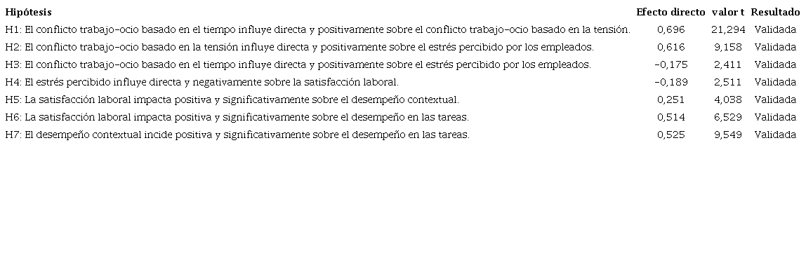 Se evaluaron los coeficientes de trayectoria, los cuales pueden variar entre +1 y -1. En el modelo contrastado, los valores de dichos coeficientes se presentan en la tabla 4. Como en ella se observa, todas las hipótesis postuladas fueron validadas.