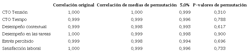 Se consideran como significativos los valores mayores a cero. Cuando los valores se encuentran entre 0 y 0,25 son pequeños, entre 0,250 y 0,50 tienen una relevancia predictiva media y si exceden 0,50 son grandes. En el modelo (figura 1), los valores son CTO tensión 0,327 (medio), desempeño contextual 0,164 (pequeño), desempeño en las tareas 0,330 (medio), estrés percibido 0,151 (pequeño) y satisfacción laboral 0,025 (pequeño).