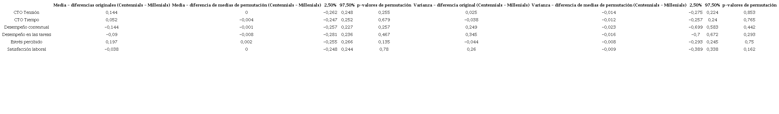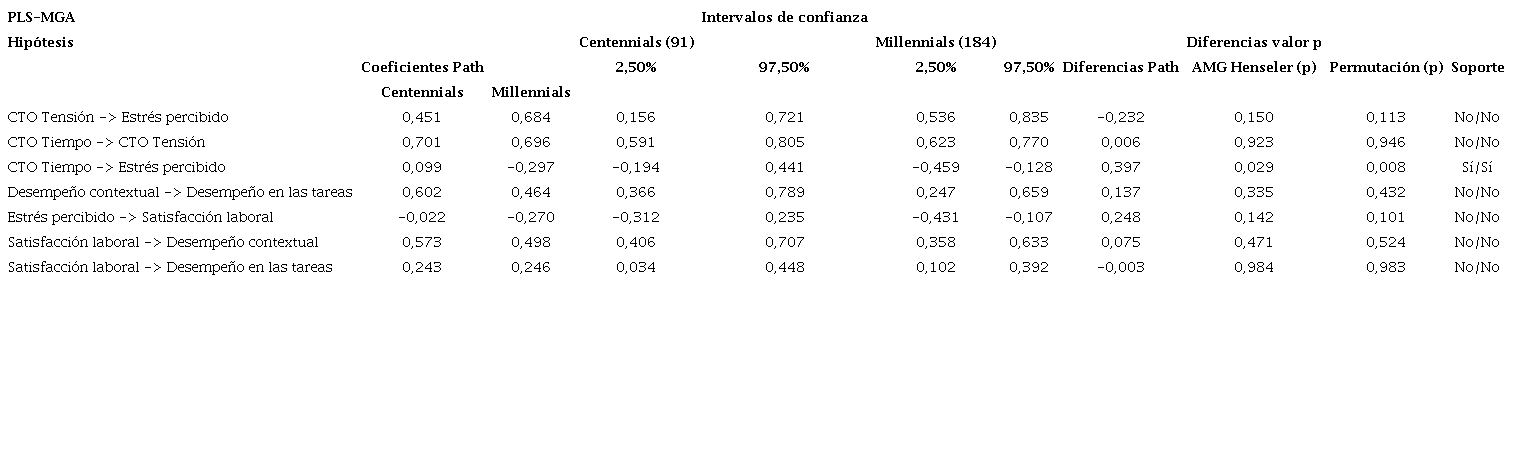 El AMG contrasta los estimadores generados por bootstrap de uno de los grupos con los estimadores del otro. En este estudio, en la comparación entre centennials y millennials, se identificó una diferencia significativa en la relación entre CTO Tiempo y estrés percibido. El efecto en los centennials es de βc = 0,099 y en los millennials es de βm = -0,297, con una β diferencia 0,397 confirmada por dos métodos (p = 0,029, MGA Henseler; p = 0,008 permutación). La tabla 8 muestra estos resultados.