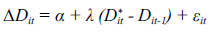 (9)Where ΔDEBTit is the dependent variable measured by the change in the market debt-to-assets ratio of firm i at time t. The variables (Dit*-Dit-1) and DEFit are defined in the same way as in models (5) and (8), respectively. If α=0 and β=1, the pecking order theory explains the adjustment of the capital structure better than the tradeoff theory, especially if λ is close to 0. However, if λ>0.3 and β is significantly less than 1, the trade-off theory is better. Model (9) was estimated using the GMM and GMMSYS methods suggested by Arellano and Bond (1991) and Arellano and Bover (1995), respectively. This model included the lag of the dependent variable ΔDEBTit-1, as well as the individual fixed effects (μi) associated with firm i and time effects (μt) associated with period t. Furthermore, the endogeneity problem caused by the lag of the dependent variable was corrected by using lags in t-2 and t-3 as instruments.