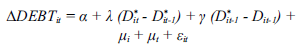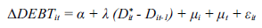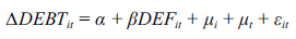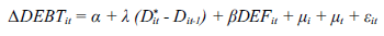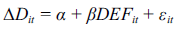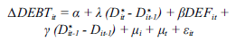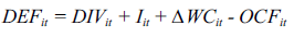 (3)Where ΔDit is the variation of the current leverage (issued or retired) of firm i in period t, and Ɛit is the stochastic error of the model. DEFit is the financial deficit of firm i at time t, which is calculated as follows: