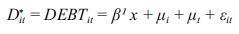 (6)Where Dit* is the market debt-to-assets ratio (DEBTit) that represents the target leverage of firm i in period t. According to previous studies, the matrix x includes the control variables associated with the firms’ qualities and the institutional and financial characteristics of the countries (Titman & Wessels, 1988; Rajan & Zingales, 1995; Dang, 2013; Kannadhasan et al., 2018). Then, the expression (6) can be rewritten as:
