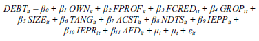 (7)Where DEBTit is the market debt-to-assets ratio of firm i in period t. The model included the controlling shareholder ownership (OWNit), firm profitability (FPROFit), firm credit quality (FCREDit), growth opportunities (GROPit), firm size (SIZEit), asset tangibility (TANGit), agency costs (ACSTit), and non-debt tax shields (NDTSit) as control variables of firm I in period t. The average public-political institutional development (IEPPjt), the average of the private-regulatory institutional development (IEPRjt), and the average development of the financial markets as a percentage of GDP, denoted as (AFDjt), were included as control variables for country j in period t. This model was estimated using the fixed effects method, which includes individual fixed effects (μi) associated with firm i and temporary effects (μt) associated with period t. Finally, Ɛit is the random residual.