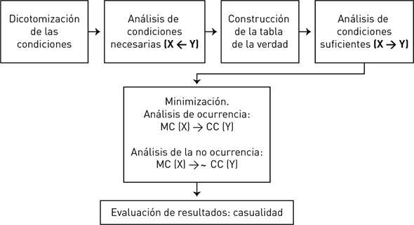 Los hallazgos de cada uno de los casos fueron comparados entre sí, identificando las similitudes y disparidades. En este punto, se usó el QCA en su variante csQCA (conjunto nítido) en el software fsQCA 3.1. De esta manera, y en línea con Bakker et al. (2011) , fue posible combinar “la fuerza de la investigación cualitativa” para conocer los casos y la cuantitativa a través de comparaciones sistemáticas entre ellos (p.497). El análisis de los datos con las técnicas Crips- set QCA, y basado en Medina et al. (2017) , incluyó siete etapas posteriores a la organización de la información e identificación de casos seleccionados para el estudio, iniciando con la “dicotomización de las condiciones”, seguido del “analisis de condiciones necesarias”, “construcción de la tabla de la verdad”, “análisis de condiciones suficientes”, “minimización” y terminando con la “evaluación de los resultados” (ver Figura 1) (Medina et al., 2017, pp. 77-112).