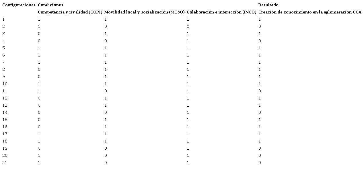 En cuanto al número de casos que deben ser parte del modelo, Marx et al. (2013) plantean que podrían estimar-se a través de una medida de referencia que muestre cuántos casos se necesitan para realizar un análisis csQCA, proporcionales a un número determinado de condiciones, donde sostiene la necesidad de un umbral de 10 % o de uno más estricto del 1 %. Este análisis cuenta con la medida propuesta, dado que se tienen cuatro condiciones que surgen en la literatura como mecanismos de creación de conocimiento: 1) interacción y colaboración; 2) movilidad local y sociabilidad; 3) competencia y rivalidad; 4) creación de conocimiento como resultado; y 21 casos pasando la prueba de referencia propuesta por el autor en un umbral del 1 %.