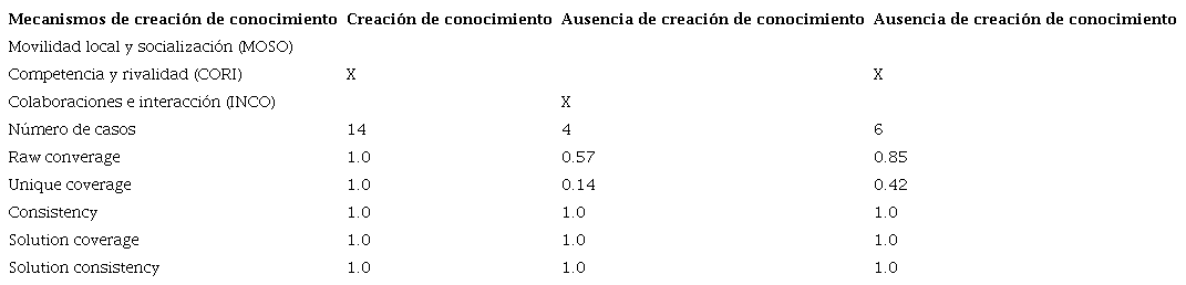Una configuración similar se obtuvo para la ausencia del resultado, con la salvedad de que en esta la movilidad local y socialización estuvo ausente con la presencia de las colaboraciones e interacciones; lo que nos dice que los bajos niveles de creación de conocimiento son posibles, aunque haya interacciones y colaboraciones cuando exista ausencia de movilidad local y socialización. Los bajos niveles de creación de conocimiento también han estado presentes cuando hay presencia de competencia y rivalidad y ausencia de movilidad local y socialización.