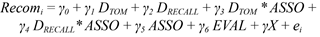 For the estimation of the models, we used two dichotomous variables or dummies (DTOM and DRECALL) representing the first three levels of brand awareness: DTOM=1 if HEI was mentioned in the first question, DRECALL=1 if HEI was mentioned in the second question. When both dummies take the zero value, the observation corresponds to the base case defined as recognition (third level of awareness). Since there was no observation at the fourth level, a third dummy was not necessary.