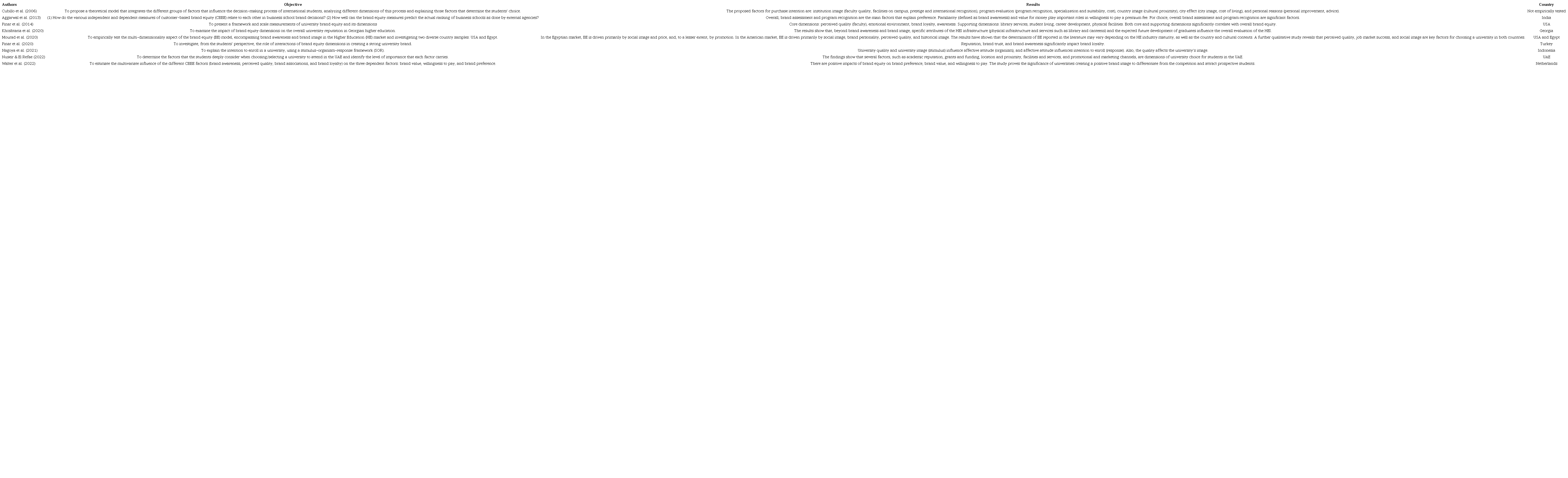 Previous research has addressed various facets of brand equity and the selection process of higher education institutions, as summarized in Table 1. Scholars have analyzed the relationship of various brand equity dimensions with loyalty (Pinar et al., 2020) and overall brand equity (Pinar et al., 2014; Khoshtaria et al., 2020). Other research has been conducted to identify the determinants of preference, willingness to pay a price premium , and choice intention (Aggarwal et al., 2013), as well as the determinants of attitudes and enrollment intentions (Nagoya et al., 2021).