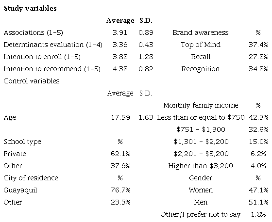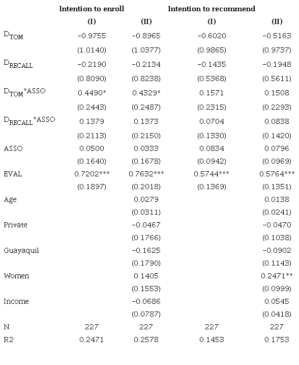 Table 2 shows the main descriptive statistics of the variables used in the study. More than one third of the sample has the focal brand in the TOM. Overall, brand associations, evaluation of choice determinants, and intentions have good average levels. It is observed that the intention to enroll in the HEI is lower than the intention to recommend it. Regarding the control variables, the average age of the applicants is close to 18 years, most of them come from private schools, the family income is mainly in the two lower ranges, and about 80% of the applicants are from Guayaquil, the main city of the Ecuadorian coast and location of the HEI, and 47% of the respondents are women.