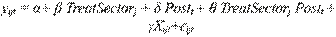 (1)Where the subscript i, j and t represent unit, sector and time, respectively. The variable y is the outcome of interest, Treat is a dummy that assumes the value of 1 if the company belongs the treatment group, and Post is a dummy for the pandemic period. α is the base result for control group prior pandemic, β gives the difference between the treatment and control group prior pandemic, δ captures the year effect that is assumed common across observations, and θ is the DID coefficient of the interaction and gives an estimation of differences in y between the treatment and control group in the pandemic period. This estimate is known as the Difference-in-Difference estimator implemented in a linear regression model. Xijt controls the characteristics of the companies that can affect the company's financial performance that can change over time, ϵijt is the disturbance term.
