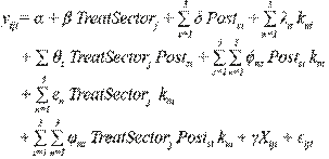 We would expect to see a significant positive or negative specific coefficient in the interaction term, increasing or decreasing the COVID-19 pandemic impact depending on the type of firm relative to the reference group. Equation 2 formalizes the heterogeneous effects of COVID-19 through the triple-difference model.