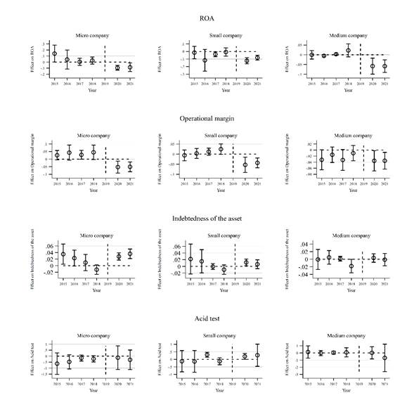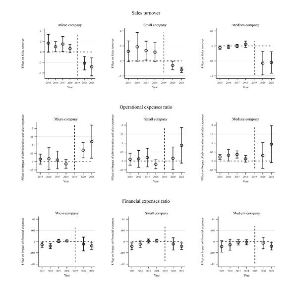 Figure 1 and Figure 2 presents the triple interaction coefficients pre- and post-pandemic (φns ) along with the 95% confidence interval. In each estimate, it is compared relative to the change observed in large companies. There is no evidence of pre-trends in most cases, except for the acid test and sales turnover of small enterprises, and the expenses ratio of medium-sized enterprises, from which we cannot draw further conclusions. These results support the assumption of parallel trends, thereby validating the main findings. The results also highlight the differentiated impact of the pandemic and economic recovery on the financial performance of companies. The effect depends significantly on the size of the company, a crucial element when considering policies for reactivation and mitigation of the effects of the pandemic.