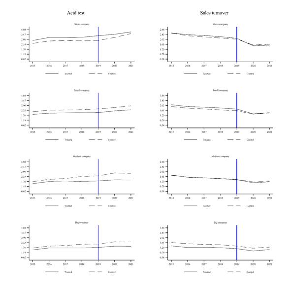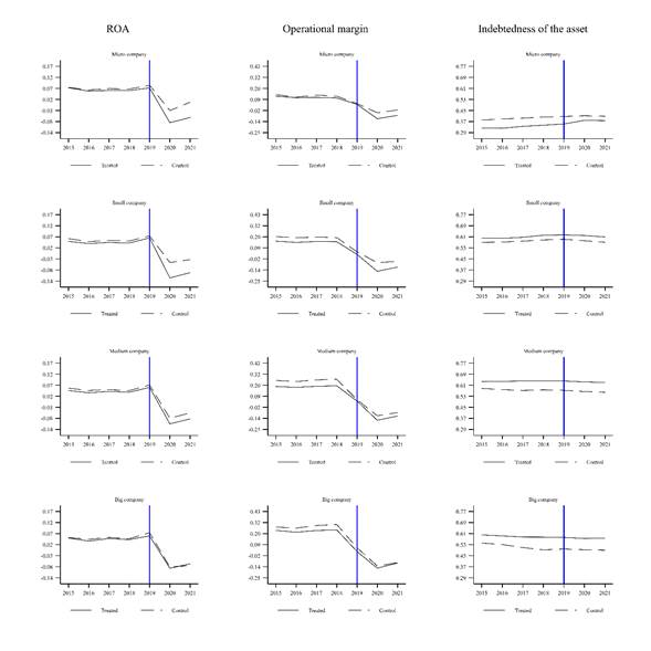To ensure the accuracy of the findings, we conducted a parallel trend analysis, which also verified the stability of the data. In order to analyze the fulfillment of the parallel trends’ assumption, we examined the evolution of the average financial indicators for the control and treatment groups during the period 2015-2020, corresponding to the availability of comparable information. The results of the parallel trend test are presented in Figure A1, A2 and A3. The graphs are constructed to check the assumptions underlying the triple difference model, which is based on the assumption that the trends between the treated and control groups were comparable prior to the onset of the pandemic. For example, the figure shows the evolution of microenterprises in the treated sector compared to microenterprises in the control group, along with the evolution of large enterprises in the treated group compared to large enterprises in the control group. The data show that the performance variation trend of both the high-impact group and the low-impact group was comparable prior to the onset of the pandemic in most cases. This indicates that variables successfully comply with the assumption of parallel trends. This similarity in trends between the control and treated groups supports further modeling.