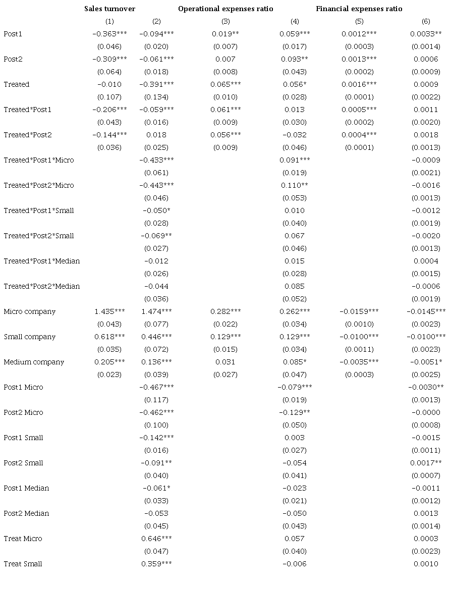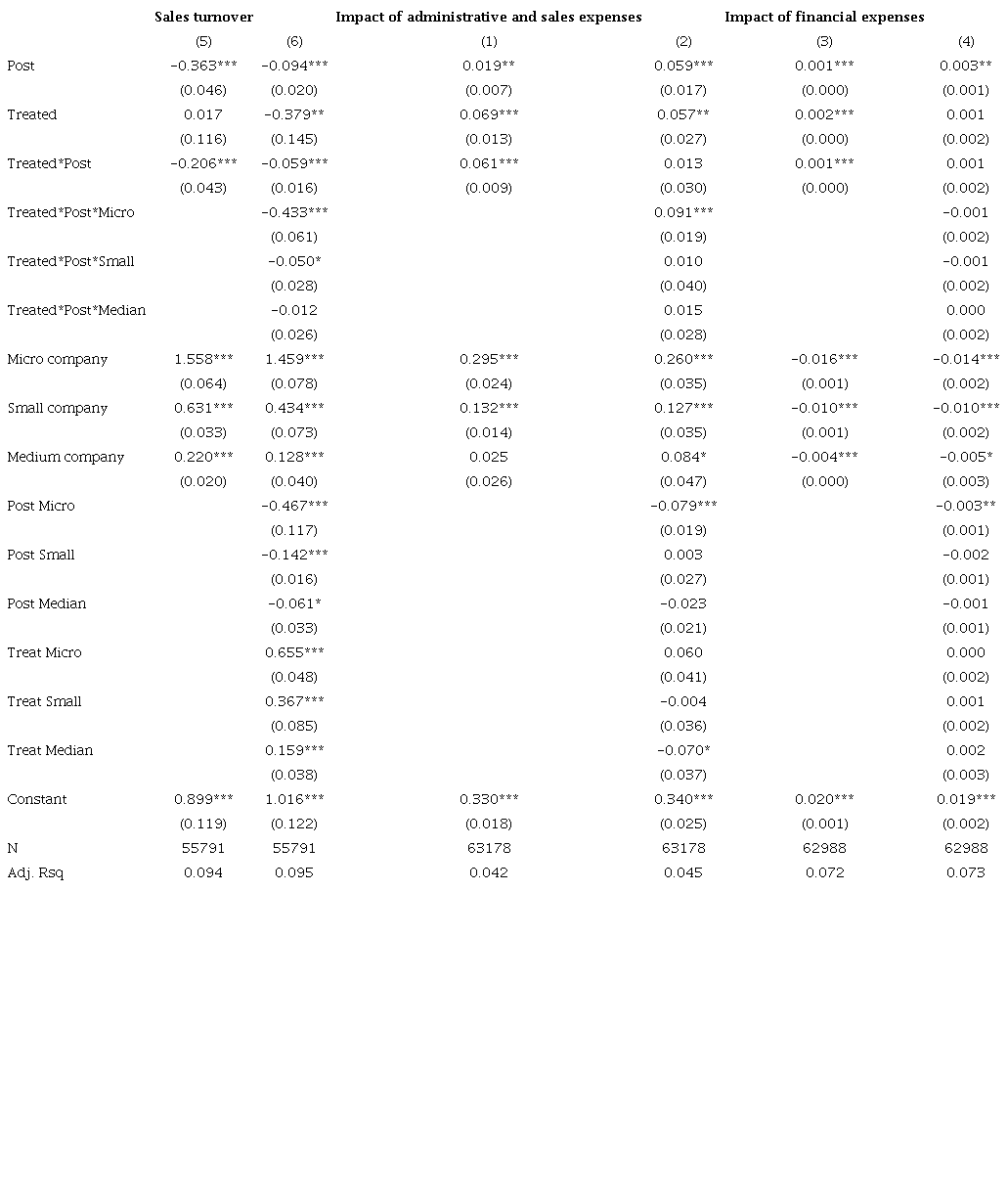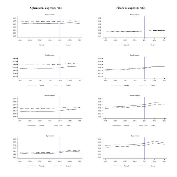 Financial expenses were also impacted by the pandemic, as evidenced by a 0.1 increase in the financial expense ratio compared to the control group (Column 5, Table 5). The results do not show a differentiated effect according to company size.