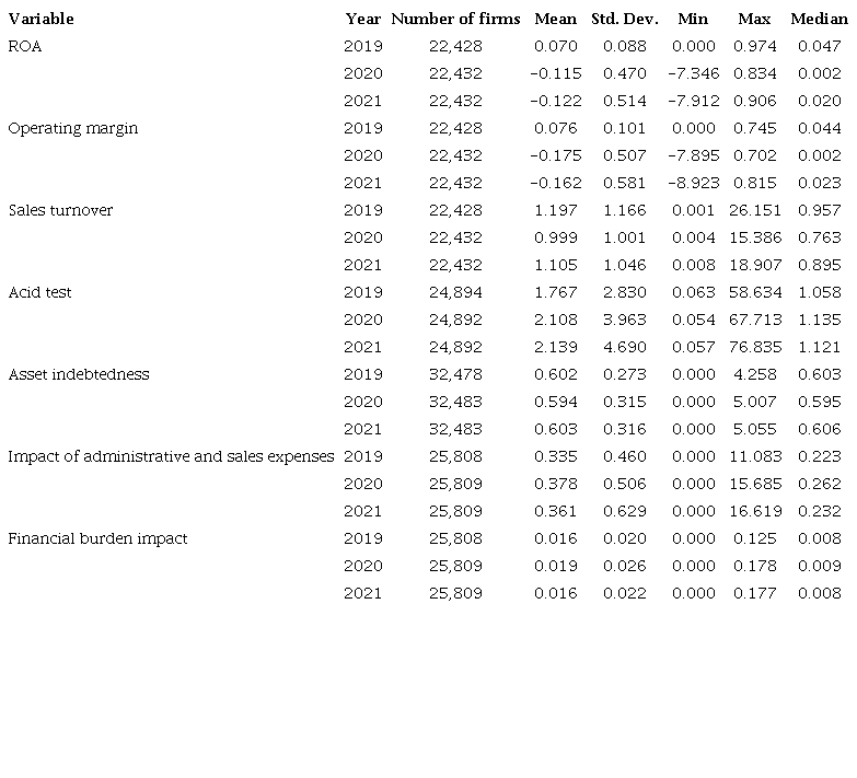 Table 2 summarizes descriptive statistics that characterize firms in panel data, which are based on financial information, and shows the impact of the COVID-19 pandemic on the main firm financial indicators. For instance, average ROA companies decreased by -18.6 percentage points (p.p.) for 2020 compared to 2019, which may respond to the decrease in operational margin and sales turnover. The description of the dependent variables is detailed in Table A1.