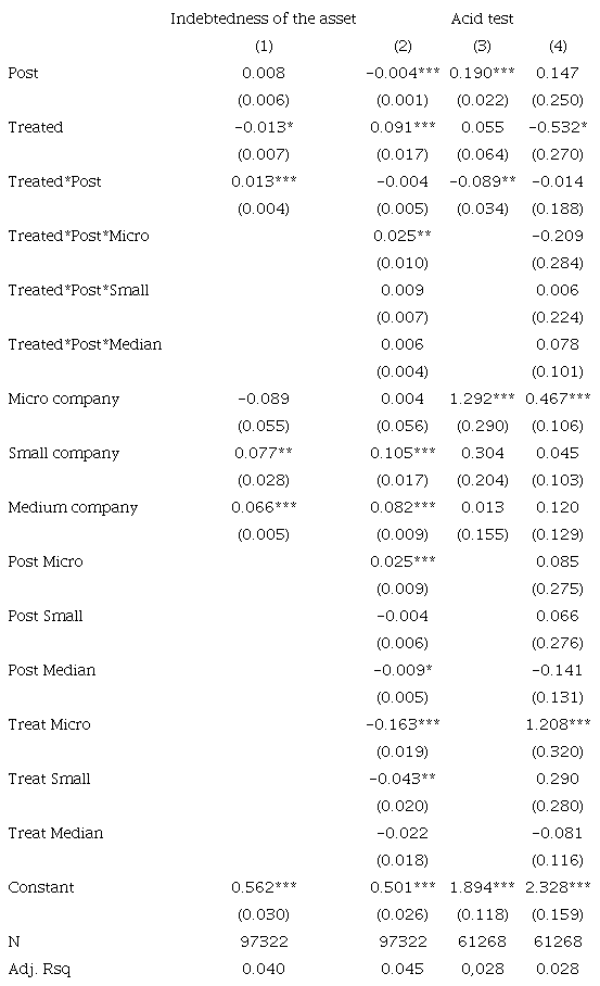 Table 4 illustrates the impact of the COVID-19 pandemic on solvency, which varies depending on the company size. According to column 1, asset indebtedness increased by 0.013 because of the pandemic, compared to the change observed in the control group. Column 2 shows that asset indebtedness increased by 2.5 p.p. in microenterprises in relation to the observed change during the pandemic. No statistically significant differentiated effect is observed for the rest of the companies. Overall results can be attributed to the fact that small and micro enterprises resorted to increasing or acquiring debts and outstanding obligations to address the lack of liquidity and cover expenses related to the acquisition of goods, inventories, rights, and other resources. Furthermore, medium and large manufacturing companies did not experience a high impact on their debt due to their capacity to meet obligations with shareholder capital and through inventory turnover. Additionally, firms in the service sectors particularly accumulated accounts payable due to their inability to operate normally, resulting in insufficient resources to cover expenses and an increase in liabilities. Maintaining a low level of indebtedness is crucial for companies as it directly contributes to their profitability and helps consolidate their market position, which prevent from closure (Achim et al., 2022; Gajdosikova et al., 2022; Zajmi, 2021). Nguyen et al. (2022) propose that the vulnerability and sensitivity of companies to the risk of accumulating debt can explain the increase in corporate indebtedness (Alshammari, 2020). Goel & Garralda (2020) and Didier et al. (2021) point out that companies significantly increased their indebtedness during the pandemic, as they had low levels of cash reserves and used these credits to cover liquidity deficits and increase their reserves. Thus, Zheng (2022) emphasizes the importance of reserves to face COVID-19 pandemic. Similarly, Bloom et al. (2021) emphasize that large companies had the advantage of accessing lines of credit, which provided support during periods of loss, unlike micro and small businesses. According to Didier et al. (2021), the substantial increase in indebtedness among companies in the services sector can be attributed to limited flexibility in debt negotiations and the absence of reserves, which forces companies to resort to indebtedness for survival.