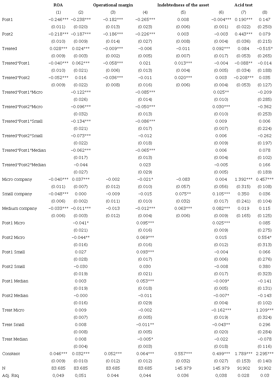 Table 3 reveals a substantial decline in the operating margin of -0.058 percentage points (p.p.) compared to the control group. Column 4 of Table 3 demonstrates a significant finding that aligns with the global impact of the COVID-19 pandemic: a notable effect on MSEs. The Table shows a strong contraction of the operating margin in all companies, in particular, micro and small enterprises.