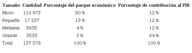 El parque empresarial costarricense está compuesto por 137 378 empresas de las cuales el 94 % corresponde a micro y pequeñas empresas (con menos de 30 empleados), el 7 % a empresas medianas (con 30 empleados, pero menos de 100), y el 3 % a empresas grandes (con más de 100 empleados). Estas últimas aportan el 63,95 % del PIB, mientras que las micro, pequeñas y medianas el 36,05 % (Ministerio de Economía, Industria y Comercio de Costa Rica - MEIC, 2021).