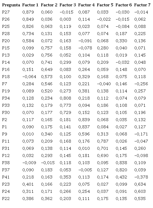 El modelo final mostró siete componentes que explican el 67,04 % de la varianza. La idoneidad de la muestra es adecuada con una medida KMO de 0,88 y una prueba de esfericidad de Barlett con una significancia de 0,00. La tabla de comunalidades de extracción también mostró resultados aceptables, con un rango entre 0,5 y 0,8. Todos los factores del modelo contaron con al menos tres variables con una carga superior a 0,4. A su vez, cada uno de los componentes obtuvo un alfa Cronbach superior a 0,7.