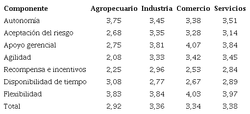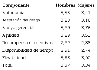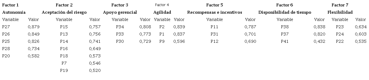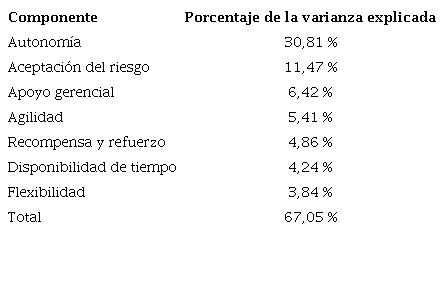 Los siete componentes resultantes fueron nombrados de acuerdo con el tema de las variables: (1 autonomía, (2 aceptación del riesgo, (3 apoyo gerencial, (4 agilidad, (5 recompensa e incentivos, (6 disponibilidad de tiempo, y (7 flexibilidad (ver tablas 2 y 3).